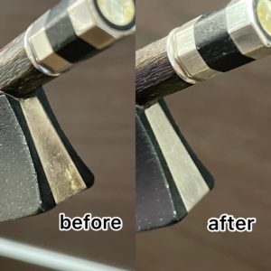 銀の部分を磨き、お手入れしたbefore/afterの写真です。 1枚目はフロッグの銀部分とアジャスターの写真。